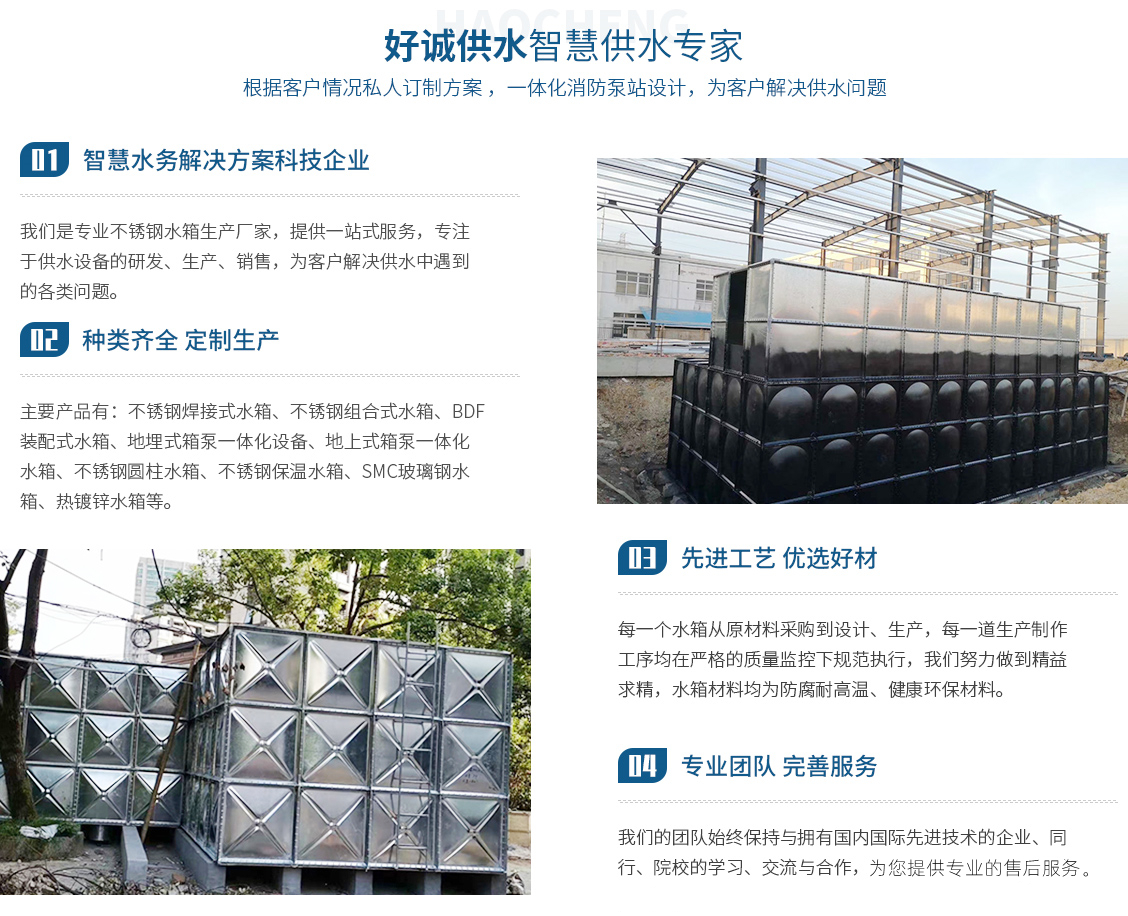 安徽好誠(chéng)供水設(shè)備制造有限公司是一家集設(shè)計(jì)、研發(fā)、制造、銷(xiāo)售、售后為一體的專(zhuān)業(yè)不銹鋼水箱生產(chǎn)廠(chǎng)家,以科技力量立足于社會(huì)。近幾年來(lái)致力于供水設(shè)備、水箱的研究與開(kāi)發(fā)。主要產(chǎn)品有:不銹鋼焊接式水箱、不銹鋼組合式水箱、BDF裝配式水箱、地埋式箱泵一體化設(shè)備、地上式箱泵一體化水箱、不銹鋼圓柱水箱、不銹鋼保溫水箱、SMC玻璃鋼水箱、熱鍍鋅水箱。對(duì)于傳統(tǒng)混凝土水箱的改造(即不銹鋼內(nèi)貼水箱),老舊水箱的拆除、更換、...